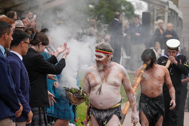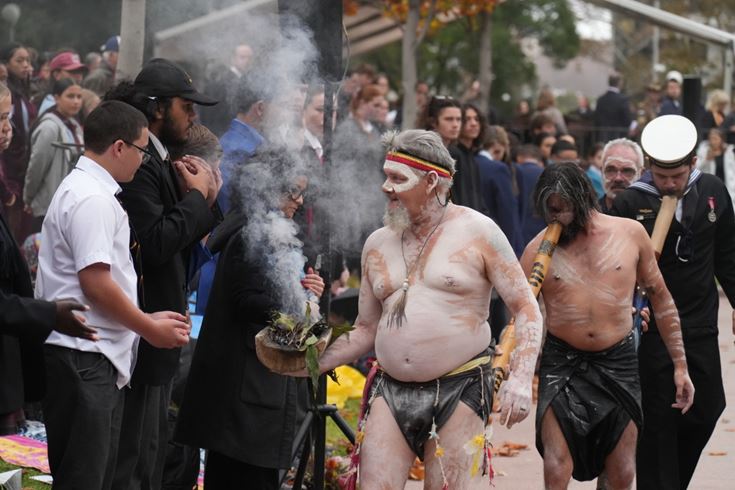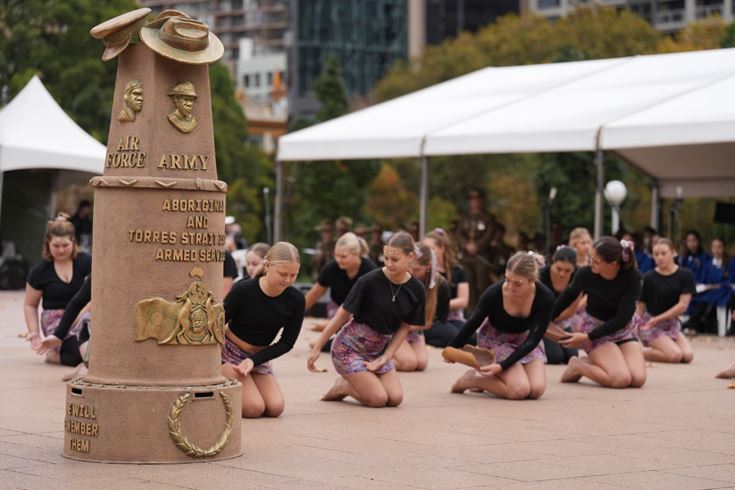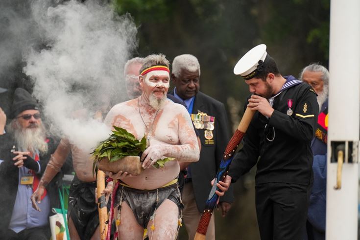 The event commemorates the service of Aboriginal and Torres Strait Islander veterans, combining conventional military protocol with Indigenous ceremonial display and with a focus on attendance by school children.